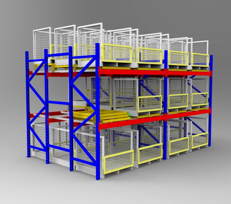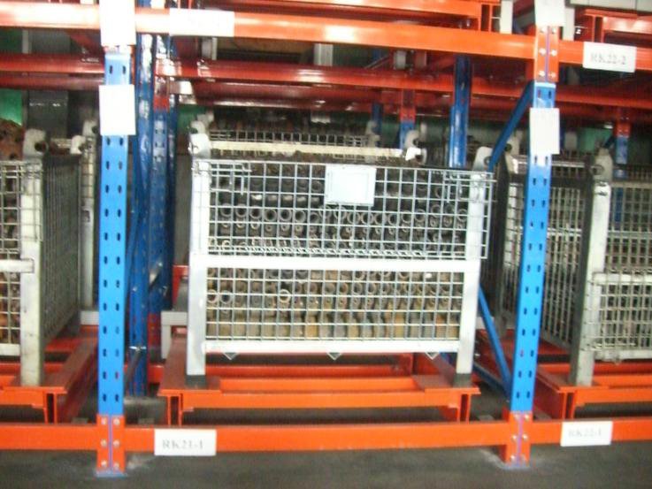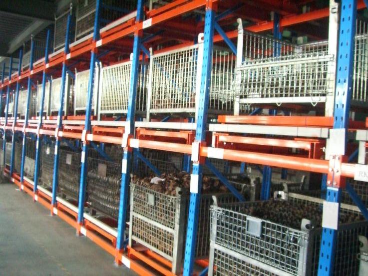 從前推入的貨架:采用軌道和托盤小車相結合的原理,軌道呈一定的坡度(3°左右),利用貨物的自重,貨物被規定于單端存儲,貨物先進后出,適用于大批量少品種的貨物存儲,空間利用率很高,存取也較靈活方便。貨架總深度不宜過深,一般在6個托盤深度以內,否則由于托盤小車相互嵌入的緣故而會使空間犧牲較大。單托貨物重量一般在1500kg以內,貨架高度一般在6m以下。